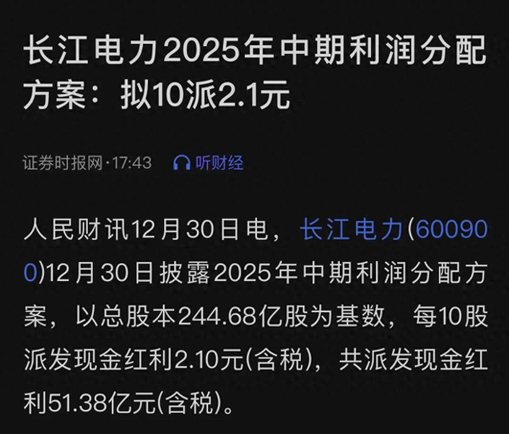 方案很直接:每持有10股长江电力股票,就能拿到2.10元的现金红利。以公司总共244.68亿股的盘子计算,这笔钱够实在的。